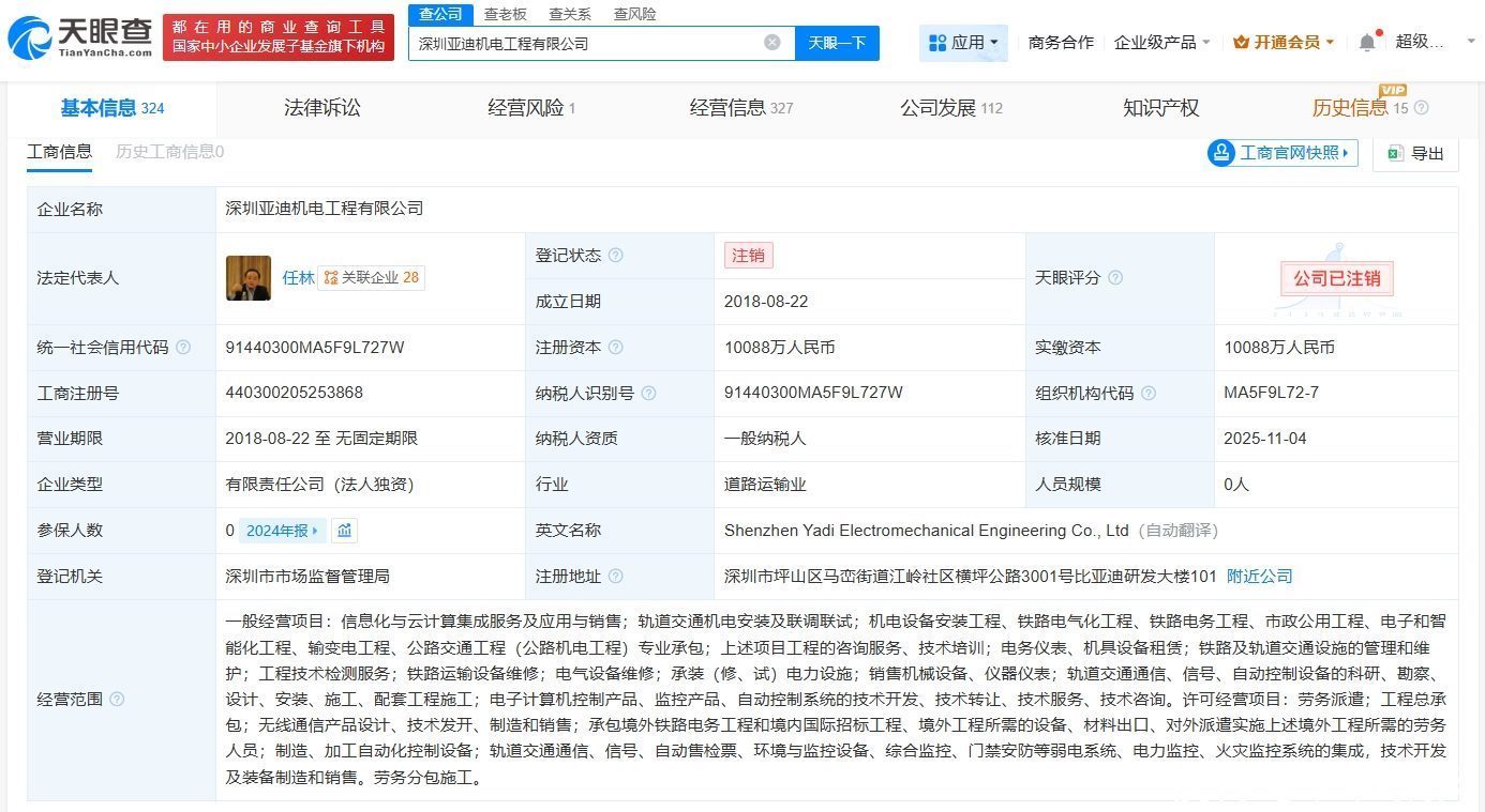 天眼查工商信息显示,近日,深圳亚迪机电工程有限公司登记状态由存续变更为注销。此前,该公司已发布注销备案公告。